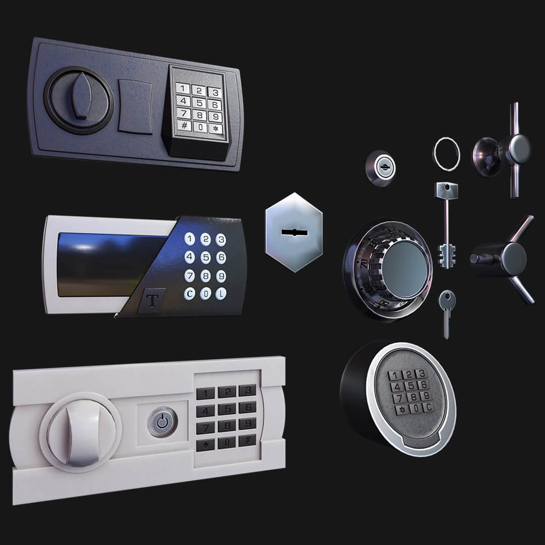 • Home safes (fireproof, floor-mounted, and wall safes)